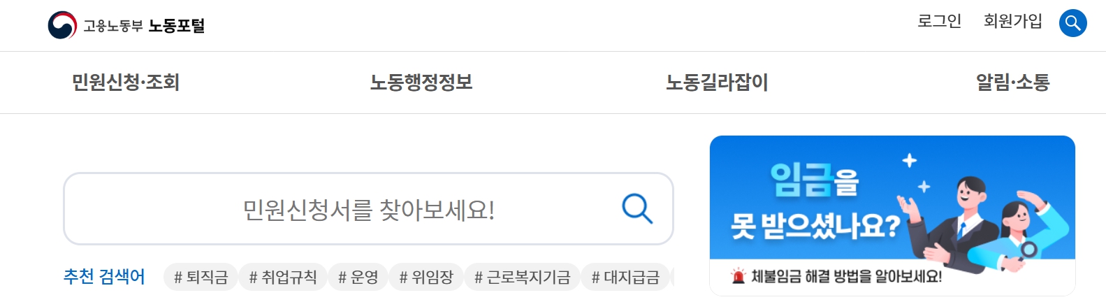 노동과 관련된 법률적 문제나 행정 업무가 필요할 때는 노동포털을 적극적으로 활용하여 보다 편리하고 신속하게 문제를 해결하시길 바랍니다.